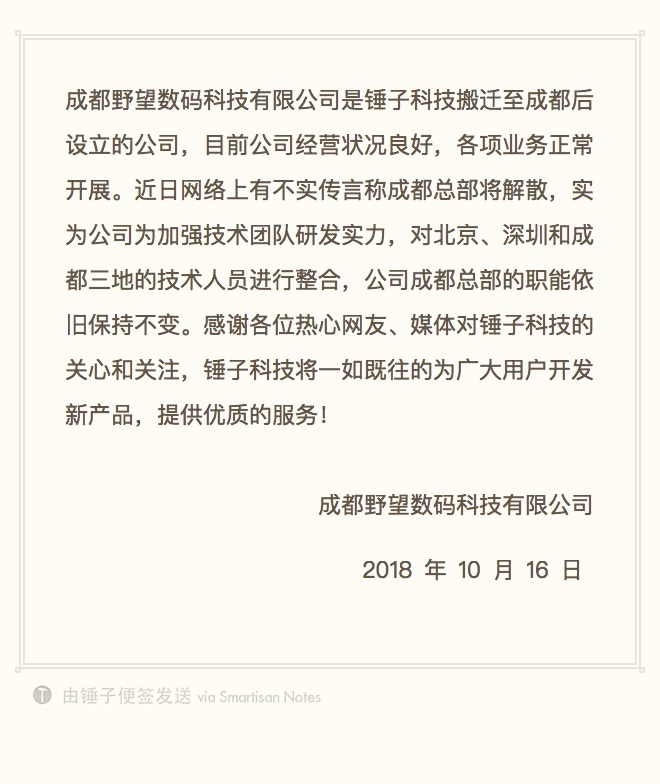 针对锤子科技闭幕成都分公司音讯,锤子科技官方微博发布一则落款为“成都野望数码科技有限公司”的