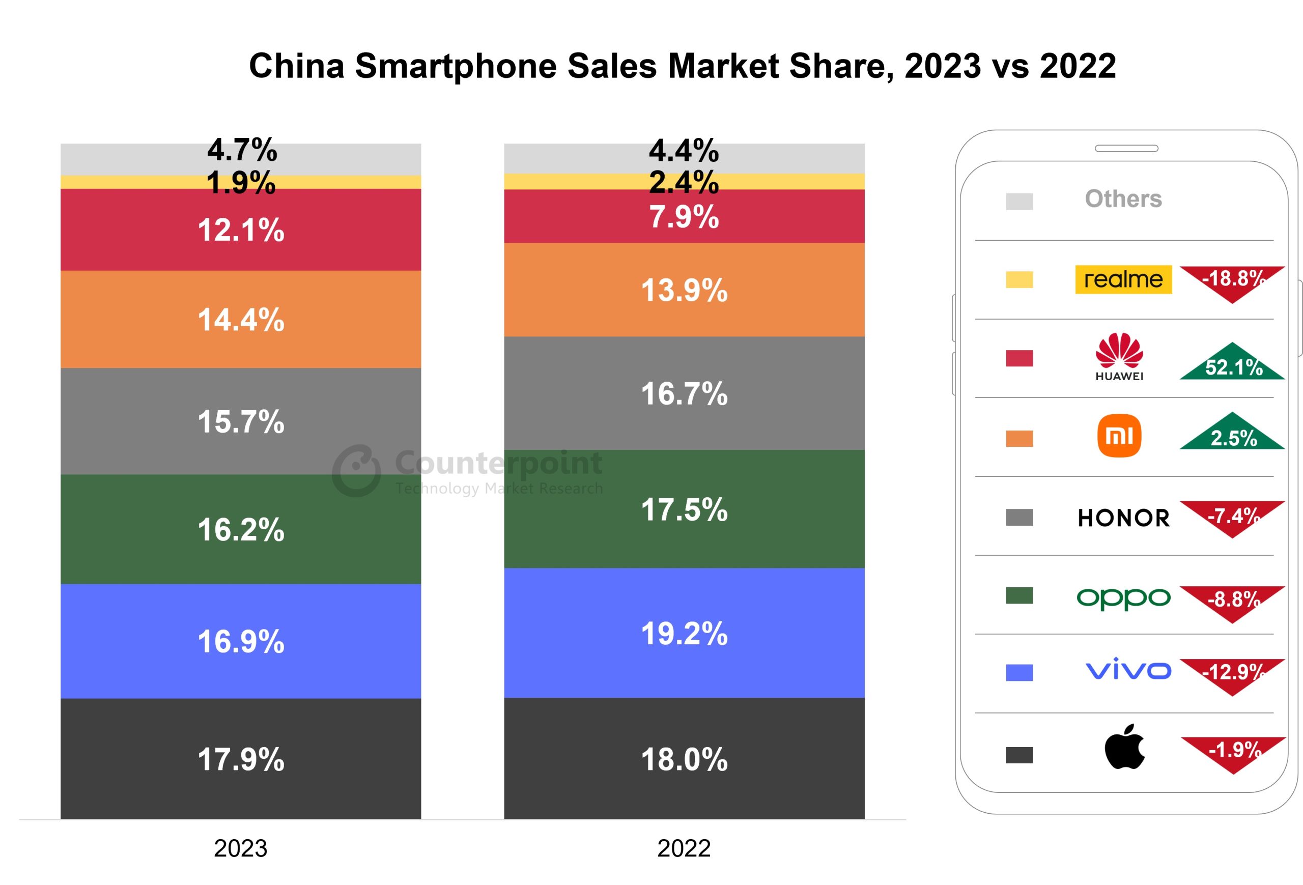 依据Counterpoint的手机销量月度陈述,2023年第四季度,我国智能手机销量触底上升,同比增加6.6%,为在接连10个季度同比下降后初次完成季度同比增加。华为凭借自研5G芯片回归商场,持续招引顾客,而小米和荣耀保持着两位数的微弱增加。