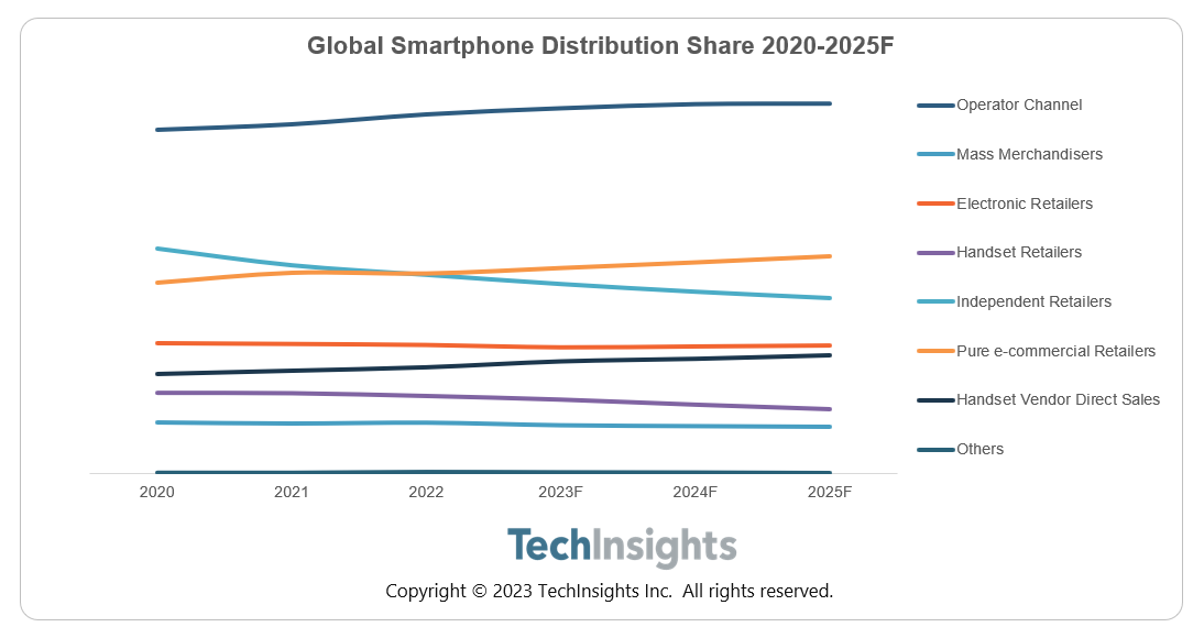 TechInsights估计,从2022年到2023年,全球智能手机运营商途径比例将持续缓慢复苏。估计它将在2025年到达峰值(受5G需求以及苹果和其他折叠屏产品推出的推进),这表明该途径的老练(契合5G智能手机的出售需求),随后将在整个猜测窗口期下降,直到2028年。运营商途径的销量首要发生在实体店内,并经过线下途径与出售代表进行面临面的互动。